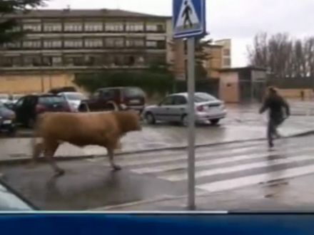 Et stort dyr på 280 kg. var sluppet ud fra det lokale slagteri og forsøgte nu at 'liste' sig tilbage til friheden. Tyren kom spadserende midt på gaden, men det er vanskeligt at falde i et med omgivelserne, når man er kæmpe-stor og har både hår og horn. Tyren fik ikke mange minutter på fri fod, før den blev opdaget af forbipasserende, der med det samme tilkaldte politiet.