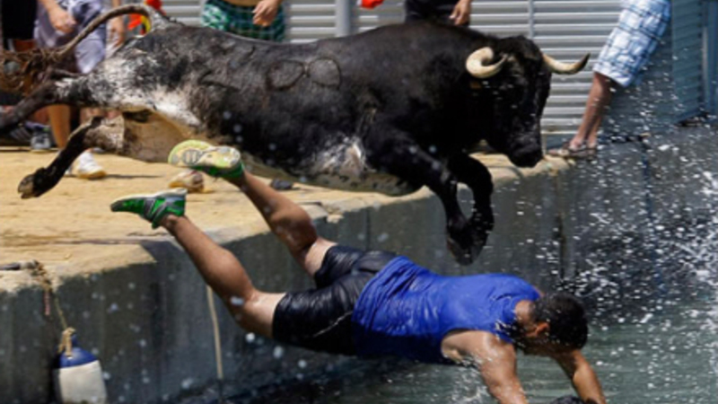Hvert år bliver der bygget en firkantet tyrefægterarena på havnen, men at arenaen er firkantet, er ikke den eneste forskel til de traditionelle tyrefægterarenaer. Denne her har nemlig kun tre vægge. Den fjerde har man ladet være åben ud mod havet, og så fortæller billedet til denne artikel vist resten af historien.