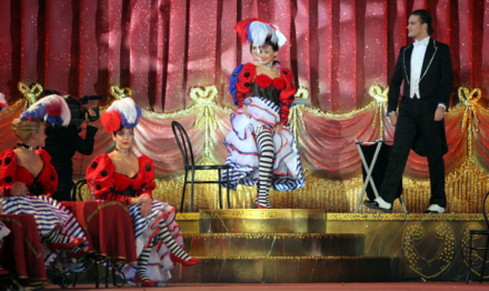 Dansere og sangere træder frem på scenen og underholder det spændte publikum med et flot dansenummer. Deres koreografi og samspil er den bedste kolofon til præsentationen af Dronningen.