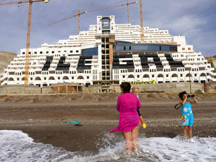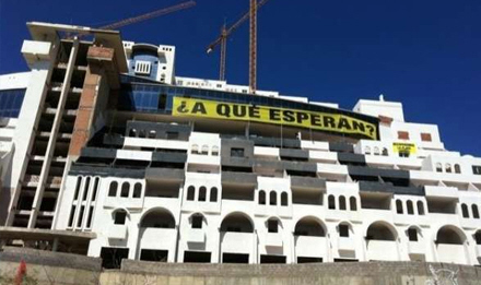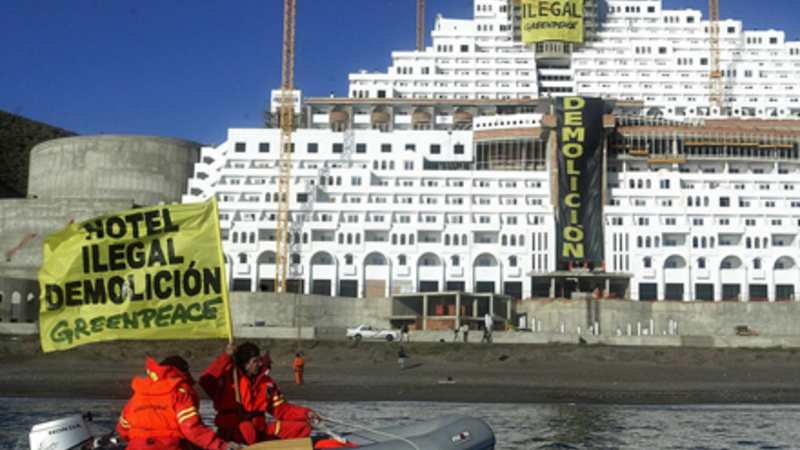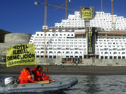 Greenpeace-aktivister har besat dele af det illegale hotel El Algarrobico, som er under opførelse i Carboneras Kommune i Almería Provinsen. Hotellet er opført i naturparken Cabo de Gata, og byggeriet har nu ligget stille i tre år.