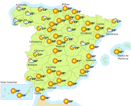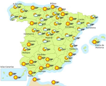 Madrid får i dag solrigt vejr, men det er blevet en smule køligere - specielt om natten. Mellem 16 og 31 grader. Barcelona får skyet vejr med byger og 21 til 27 grader, Valencia, letskyet med enkelte byger, med det klarer op i løbet af eftermiddagen. 23 til 31 grader. I Málaga er det dog fortsat solrigt med 21 til 30 grader.