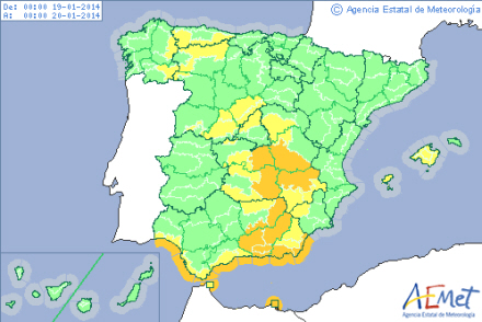 Mest udsat er Costa del Sol, der er i orange bredskab, mens de østlige og nordvestlige egne er i gult beredskab. Også nogle af kanarieøerne er i gult beredskab, og det bliver opgraderet til orange lørdag.