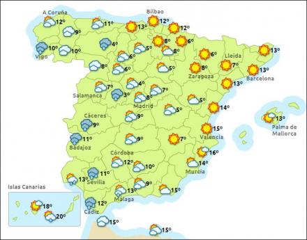 I Centralspanien er der udsigt til sne i Ávila, León, Salamanca, Zamora, Madrid, Cáceres, Segovia, Soria og Ourense. Snegrænsen faldt i morges til 900 meter, men stiger igen i løbet af dagen til mellem 1.000 og 1.200 meter.
