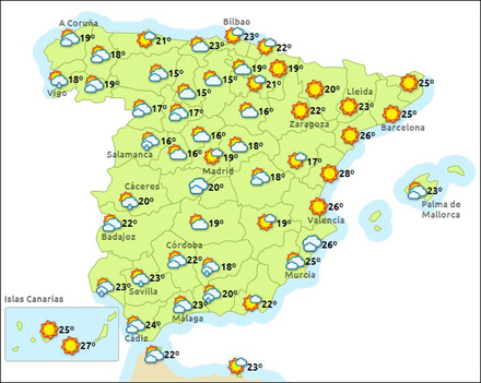 Madrid får i dag letskyet vejr med mellem 14 – 21 grader, Barcelona letskyet og 19 – 26, Valencia ligeledes letskyet med mellem 18 – 25, men i Málaga er det decideret overskyet og mellem 19 – 24 grader.