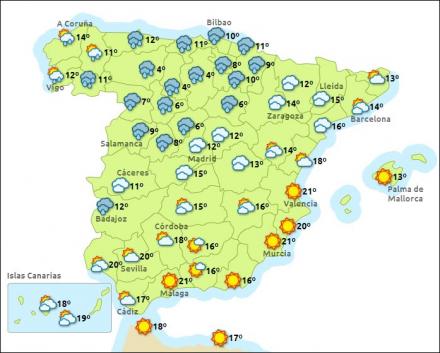 Der er varsel om hård vind i Galicien og Cantabrien. Hele den nordlige tredjedel får i dag ret skyet vejr, og der er udsigt til koldere vejr i de næste dage.