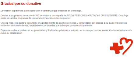 Takket være dit gavmilde bidrag på xx euro til kampagnen for hjælp til de mennesker, der er ramt af krisen i Spanien, kan Røde Kors gennemføre samarbejdsprojekter og nødaktioner.