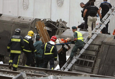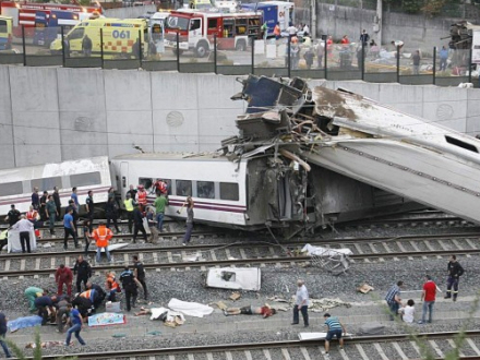 Der var 218 passagerer i toget Alvia 151 som forbinder Madrid og kystbyen Ferrol i Galicien i det nordvestlige Spanien. I et sving få kilometer uden for pilgrimsbyen Santiago de Compostela kørte toget af skinnerne, og samtlige 13 vogne væltede.