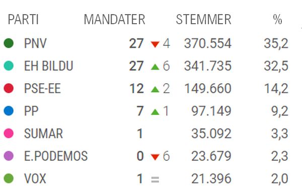 Det blev et valgresultat, hvor de fleste var glade: PNV blev valgets vinder, selvom partiet mistede 4 mandater. EH Bildu var glade, fordi de vandt seks mandater. PSE-EE var glade fordi de vandt to mandater, som meningsmålingerne ikke havde forudset. PP var også glade for at gå ét mandat frem, Sumar og Vox glade for hver ét mandat.