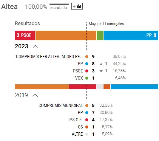 Kommunene i Alicante Provinsen er medtaget efter ønske fra en Amigos. Med 9 pladser har PP øger sit absolutte flertal i byrådets 13 medlemmer.