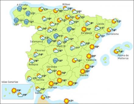 Madrid har i dag overskyet vejr med regn og seks – 13 grader, Barcelona med tiltagende skydække og ti – 17 grader, Valencia solrigt og 11 – 21 grader og Málaga med letskyet vejr og 11 – 18 grader.