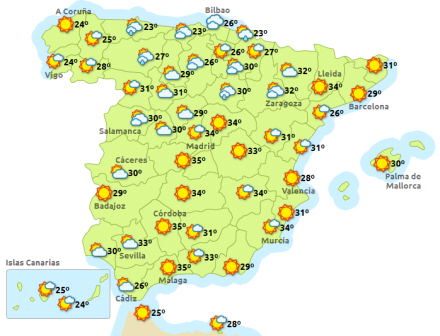 Der er sol over alle storbyerne i dag. Madrid får mellem 21 - 36 grader, Barcelona 21 – 29 grader, Valencia mellem 23 – 32 grader og Málaga mellem 24 – 33 grader.