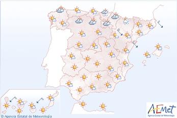 Hele landet går i dag stort set tørt og ret solrigt vejr, lige med undtagelse af den nordlige del af Baskerlandet, som får skyet vejr og mulighe...