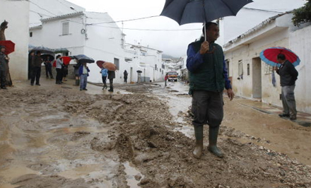 En mand løber ned ad en gade i byen Villanueva del Rosario; en af de regnramte kommuner, hvor vandet har fejet flere køretøjer af vejen.