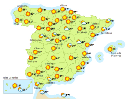 Tirsdag trænger en ny varmefront fra Afrika ind over landet, og det banker termometret op i nærheden af 40 grader flere steder i Sydspanien. Heden fortsætter frem til slutningen af ugen, hvorefter det igen bliver lidt køligere og mere skyet.