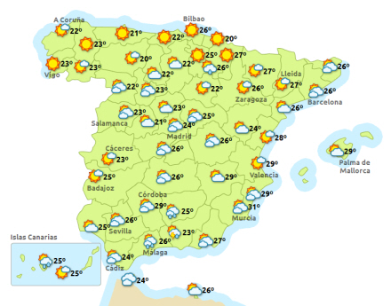 Vejret i Spanien, søndag klokken 14:00