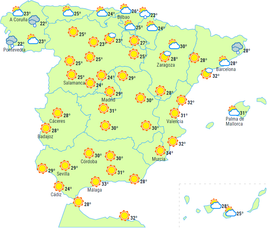 Dagstemperaturerne stiger på de cantabriske kyster og ved Middelhavet samt på Balearerne og i Extremadura, mens de falder i resten af landet. Temperaturerne forventes at overstige 35 grader i de indre egne på den sydlige halvdel, Costa del Sol, de nordøstlige dale, Fuerteventura og de sydlige egne af Gran Canaria og Tenerife. Vi kan nå 40 grader i det indre af Murcia.