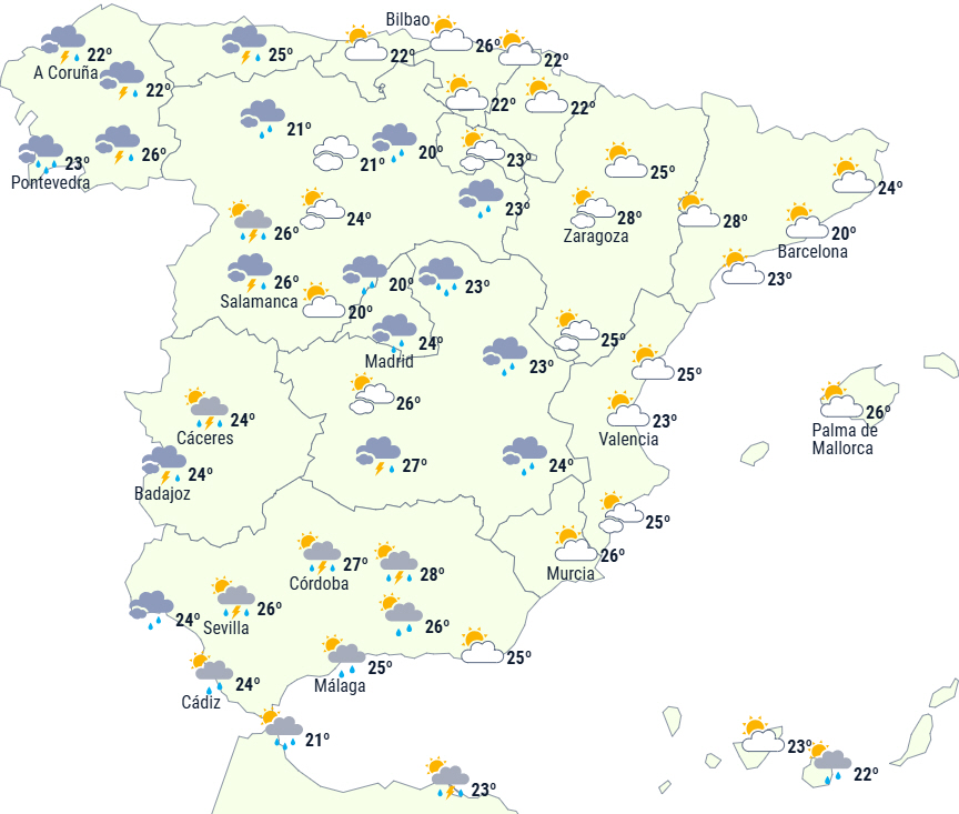 Dagen bringer stabilisering til det meste af landet, dog med nogle betydelige regnbyger tidligt på dagen i Galicien og spredte eller mindre kraftige byger i resten af landet.