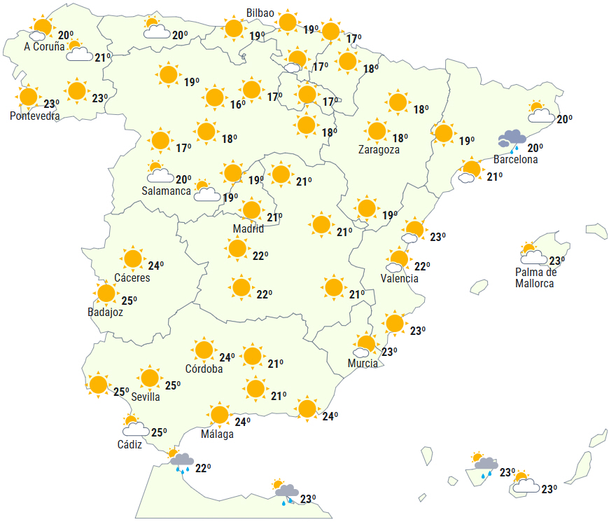 Over resten af Den Iberiske Halvø er der klar eller letskyet himmel, dog med lavthængende skyer og morgentåge i det centrale øst og områder af den nordlige og sydøstlige tredjedel.