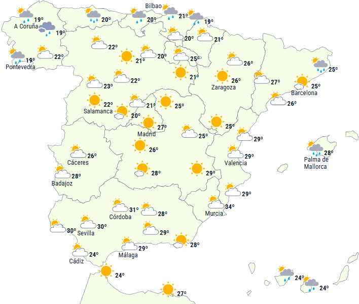 Temperaturerne falder på næsten hele Den Iberiske Halvø, så nu får vi mere behagelige temperaturer på mellem 25 og 34 grader, og nattemperaturerne kommer ned på mellem 13 og 24 grader.