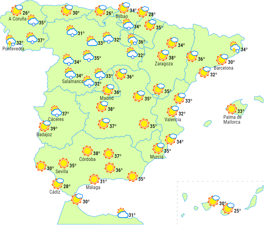 Advarsler om lokale kraftige tordenbyger til den nordvestlige del af halvøen og i Pyrenæerne, mens der varsles høje temperaturer til den nordøstlige del og sydlige halvdel af halvøen.
