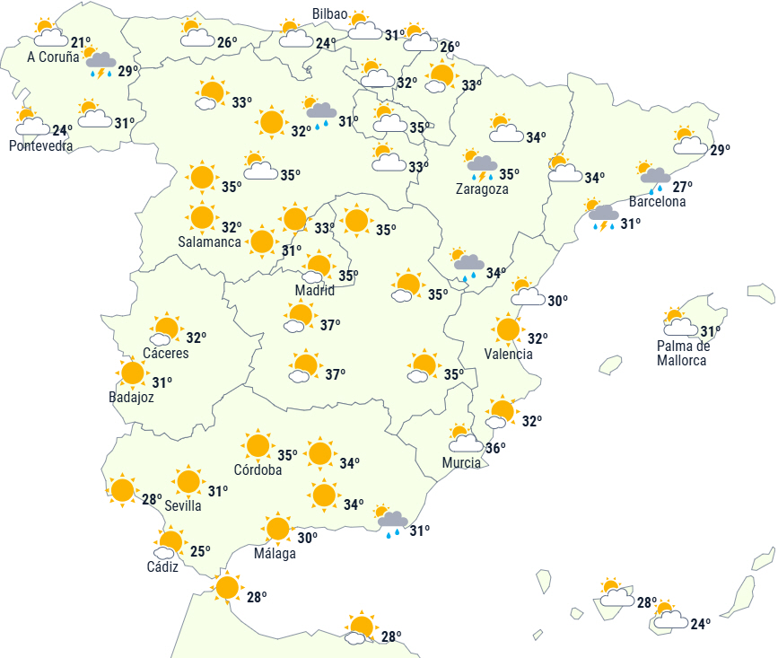 Dagstemperaturerne forbliver på 34 til 36 grader i store dele af den sydlige halvdel, det nordlige højland og Ebro-området. I disse områder, herunder det sydlige højland og middelhavskysten, forventes nattemperaturerne fortsat ikke at falde under 20 grader.