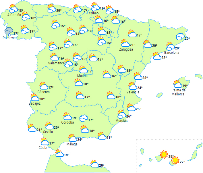 Dagstemperaturerne vil stige overalt, undtagen i den vestlige del af Galicien og på Balearerne, hvor de forbliver uændrede. Nattemperaturer med små ændringer. Let frost i Pyrenæerne.
