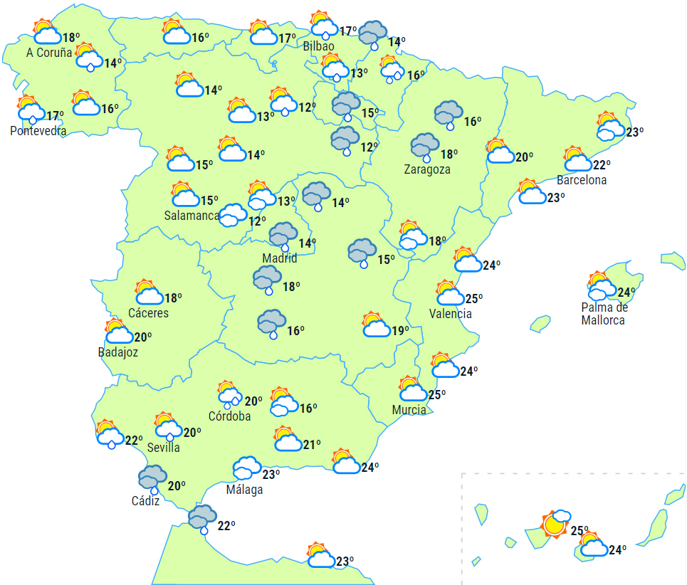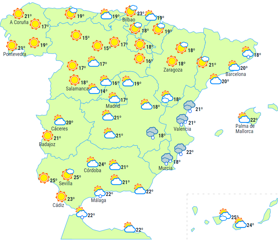 På Balearerne, i Valencia, på den sydøstlige del af halvøen og det østlige Alboran forventes overskyet vejr med sandsynlighed for nedbør ledsaget af tordenvejr, som lokalt kan være kraftigt eller vedvarende i den sydlige del af Valencia, det nordlige Alicante og i dele af Murcia-regionen.