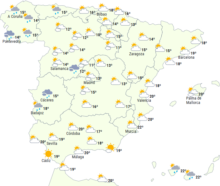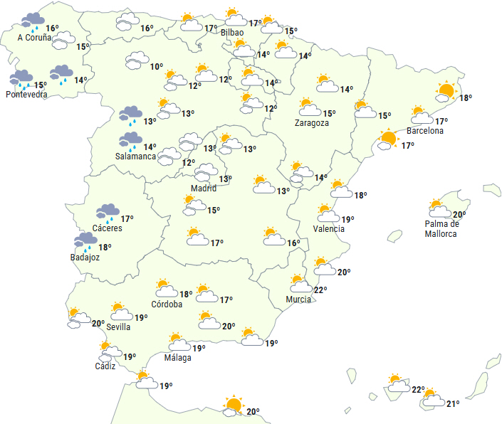 Det forventes, at passage af en atlantisk front vil give skyet eller helt overskyet himmel over den nordvestlige del af Den Iberiske Halvø og perioder med skyet vejr på resten af halvøen og De Baleariske Øer, men tendens til stadig mere klar himmel i løbet af dagen.