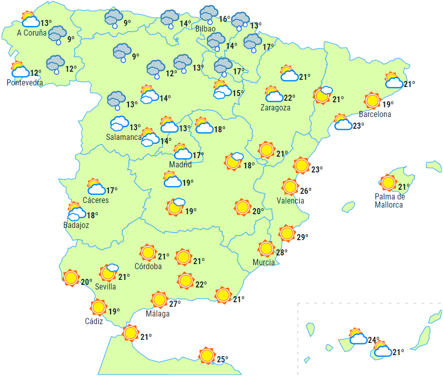 Dagstemperaturerne vil stige i nordvest og falde på De Kanariske Øer og i kystområderne på den sydlige tredjedel af halvøen. Temperaturerne forventes at overstige 30 grader i Guadalquivir-dalen. Nattemperaturerne vil falde i de indre områder i øst, centrum og sydvest. Der vil forekomme svag frost i Pyrenæerne. Kun få ændringer i resten af landet.