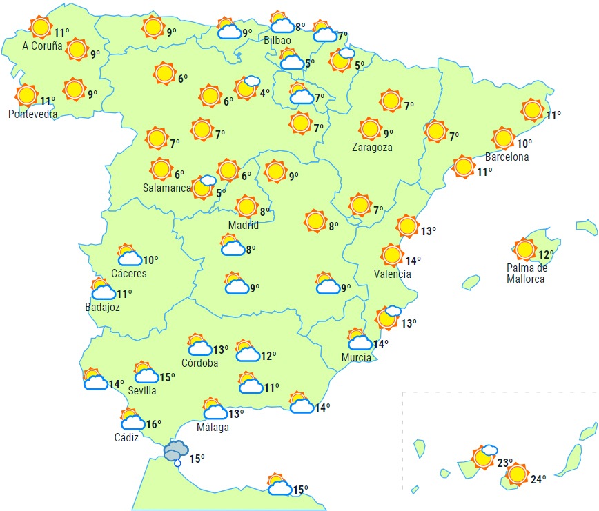 Dagstemperaturerne vil stige på De Kanariske Øer og falde på den nordlige halvdel af halvøen. Nattemperaturerne vil falde på det meste af halvøen. Frosten vil tage til i både omfang og intensitet og dække en stor del af halvøens indre egne, bortset fra den sydvestlige del og de kystnære områder. Lokalt tung frost i Pyrenæerne og på bjergtoppene på den nordlige halvdel af halvøen.