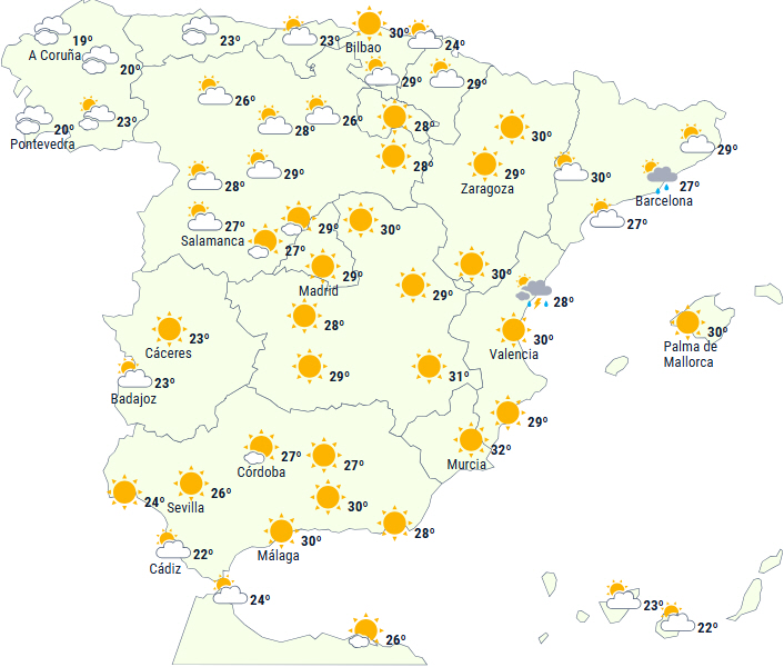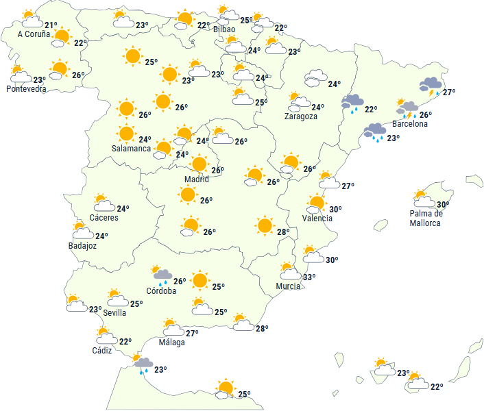 Der er i dag orange varsel for storm og regn i Aragón, Catalonien, Navarra, Castilla y León, La Rioja og Baskerlandet. Der er også udsendt gult varsel for de samme vejrforhold i Cantabrien og Asturien. Aragón og Castilla-La Mancha er også i gult varsel på grund af høje temperaturer, mens det i Andalusien gælder kystnære fænomener som oprørt hav og blæst.