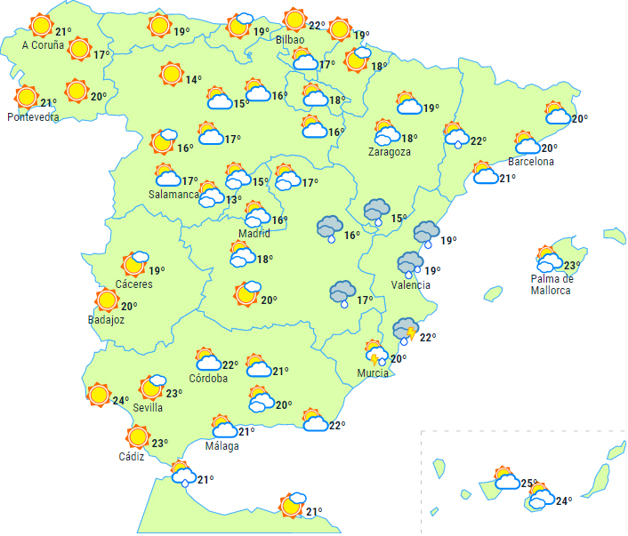Skyet eller overskyet i Valencia, det helt sydlige Catalonien, det østlige Murcia og de vestlige af Balearerne, og det kan give kraftige eller vedvarende regn- og tordenbyger, som nævnt meget kraftige på Valencias kyst.
