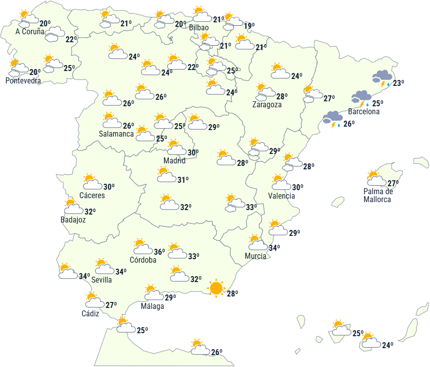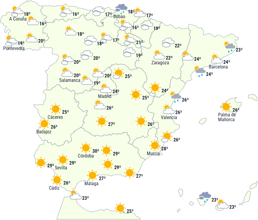 Tidligt om morgenen forventes lokale byger og tordenvejr på de catalanske kyster, men det er heller ikke udelukket på De Baleariske Øer. Ligeledes vil passagen af en front give letskyet himmel og nedbør til den nordligste del af Den Iberiske Halvø, men efterhånden tendens til at aftage mod vest.