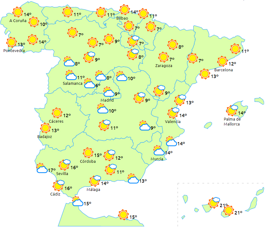 Skyet i Middelhavsområdet med svage og spredte byger til den sydlige halvdel. Om morgenen lavtliggende skyer og risiko for tæt tåge i Baskerlandet, den øvre Ebro-dal, den østlige del af den sydlige højslette og lavtliggende egne i Huesca og Lleida.