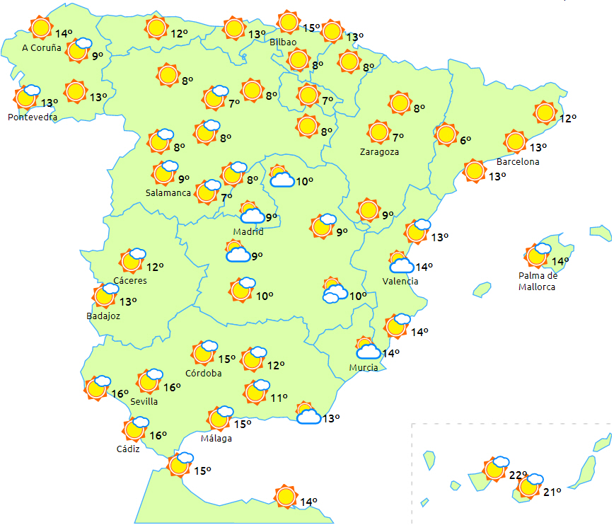 Dagstemperaturerne vil generelt falde, selvom de dog vil stige en smule i den helt nordlige del af halvøen og på begge øgrupper. Nattemperaturerne vil falde i det meste af landet med frost til stort set helt den nordlige og østlige del af halvøen, men som vanligt koldest i Pyrenæerne.