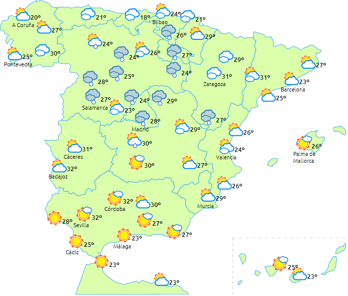 Der forventes også efterhånden flere skyer over det meste af halvøens indre egne, der kan give byger og torden i eftermiddag i nordvest, dele af De Iberiske Randbjerge og i Pyrenæerne, men det kan også ramme andre bjergområder på halvøen.