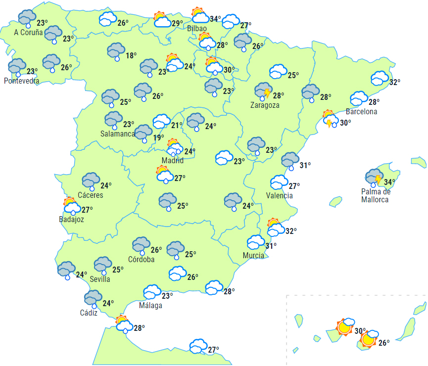 Varsler om lokalt kraftig eller vedvarende nedbør til store dele af halvøen. Dagstemperaturerne falder også markant på en stor del af halvøen, mens det fortsat er meget varmt på Balearerne.