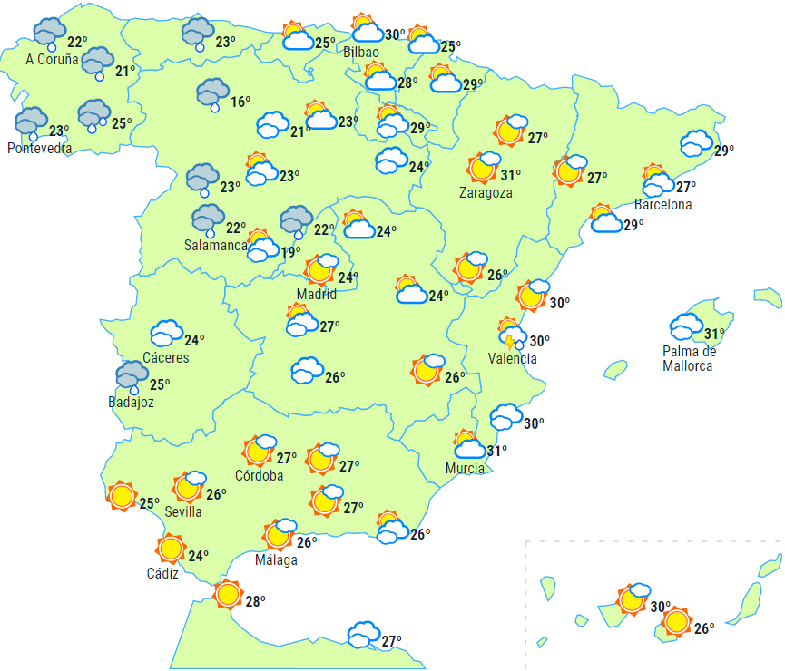 På grund af en front vest for Galicien forventes skyet eller overskyet vejr til det meste af halvøen med næsten udbredt regn og byger. Lokalt kraftige eller vedvarende og lejlighedsvis med tordenvejr især i Galicien, Extremadura, den sydlige højslette, det vestlige Andalusien, Aragón og Catalonien.