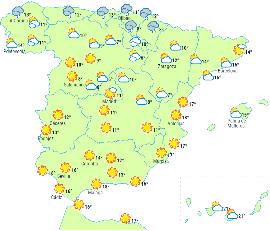 Temperaturerne vil fortsætte med at falde på det meste af halvøen og begge øgrupper, bortset fra om dagen, hvor de vil stige let i nordvest. Frost i halvøens bjerge, moderat frost i Pyrenæerne og muligvis også på hederne og det nordlige højland.