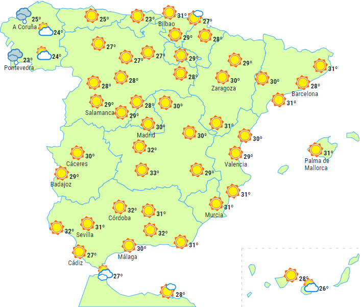 Dagstemperaturerne falder på De Kanariske Øer, den sydvestlige tredjedel af halvøen, det sydlige Catalonien og vestlige Galicien. Stigende i resten, men især i den østlige ende af det cantabriske område, hvor stigningerne vil være ekstraordinære. Nætterne bliver svalere på den sydøstlige tredjedel af halvøen og på De Kanariske Øer, mens de generelt stiger på resten af halvøen. Bortset fra på den nordvestlige del af halvøen forventes temperaturerne at nå 35 grader i store dele af de indre dele, og vi kan endda ramme 40 grader i det østlige Andalusien og Ebro- og Guadalquivir-dalene.