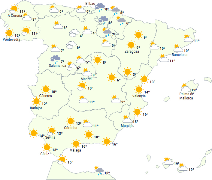 Nattemperaturerne vil generelt falde, bortset fra i og omkring Ebro-dalen med svage til moderate frostforhold i bjergområderne og højlandet på den nordlige halvdel af fastlandet samt i højtliggende områder på den sydøstlige del.