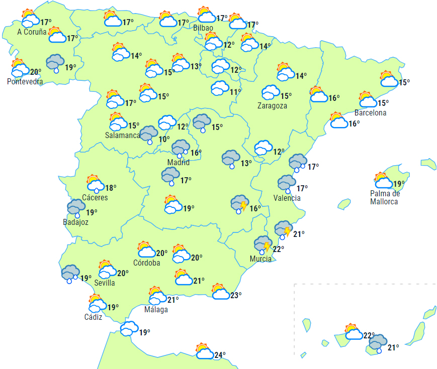 Der forventes ingen nedbør i Det Cantabriske Hav, den øvre Ebro-dal, i nordøst og på Menorca. Lokalt meget stærke eller vedvarende byger og ledsaget af tordenvejr til den vestlige og sydlige del af Andalusien og dele af Levante-området, men muligvis også i de centrale bjerge.