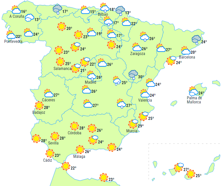 Klart, bortset fra nogle skyer om morgen ved nordkysten. Risiko for let calima. Temperaturerne falder en smule på de sydlige kanter til 20 til 27 grader, men lokalt kan vi stadig nå op på 30 til 32 grader i det sydlige og vestlige indland.