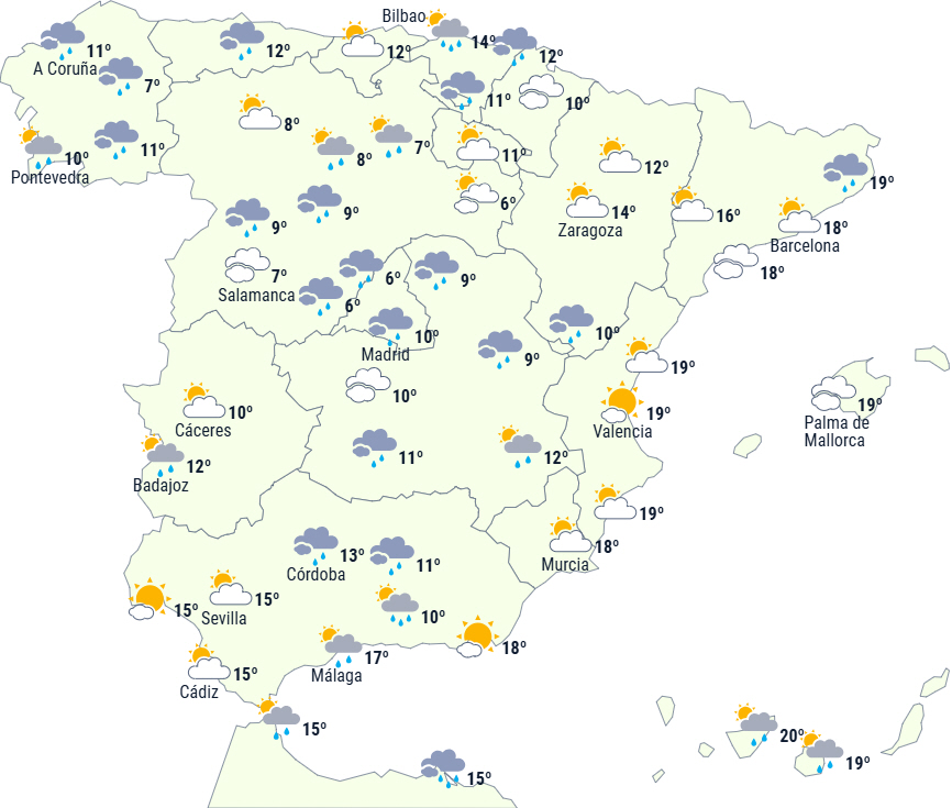 Den ustabile vejrsituation forventes at fortsætte på Den Iberiske Halvø og De Baleariske Øer, hvor en koldfront, der trængte ind fra nordvest den foregående dag, vil fortsætte sin passage fra vest mod øst og give overskyet himmel eller helt gråvejr og nedbør på sin vej.