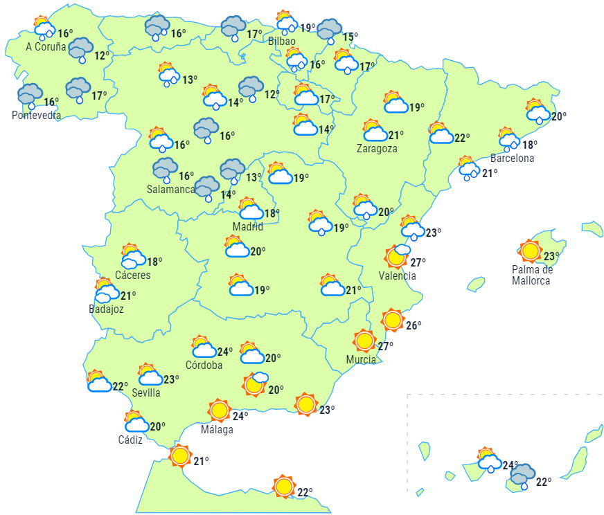 Det ustabile vejr forventes at fortsætte i det fjerne nord med gråvejr og byger, der påvirker Galicien i begyndelsen af dagen, men efterhånden også nordvestkysten, den øvre Ebro-dal, Pyrenæerne og Catalonien.