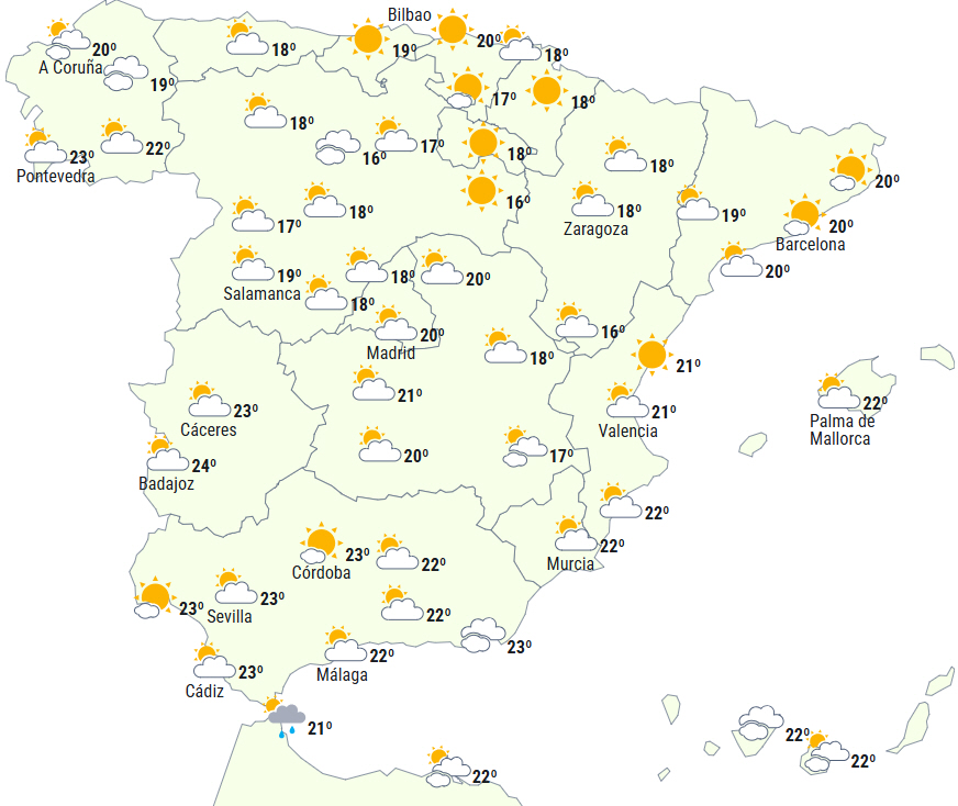 Fra de første timer forventes skyet himmel med byger og tordenvejr i den indre og nedre del af Ebro-dalen, de valencianske kystområder og på De Baleariske Øer - i første omgang med mindre intensitet end i de foregående dage undtagen altså på Menorca.