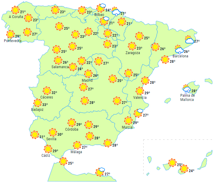 Om eftermiddagen tiltagende skydække over den østlige tredjedel af halvøen med mulighed for nogle byger, men det er dog mest sandsynligt og med lejlighedsvis tordenvejr i Catalonien og Huesca-Pyrenæerne.