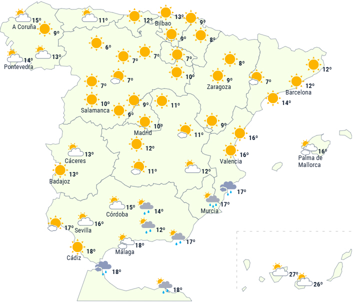 Overvejende letskyet eller klar himmel på halvøen. Der forventes kun nogle skyer over Gibraltarstrædet og den sydøstlige tredjedel med mulighed for svag og lejlighedsvis nedbør.