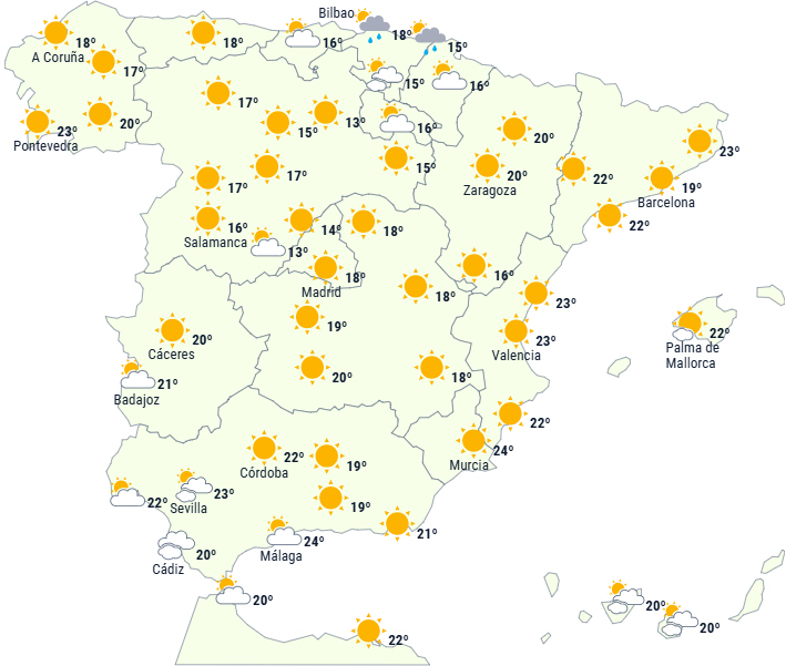 Dagstemperaturerne forventes generelt at stige generelt på Den Iberiske Halvø og De Baleariske Øer. Nattemperaturerne falder på den nordvestlige del, mens der forventes lette stigninger i resten af landet. På De Kanariske Øer forventes ingen væsentlige ændringer. Svag frost i Pyrenæerne.