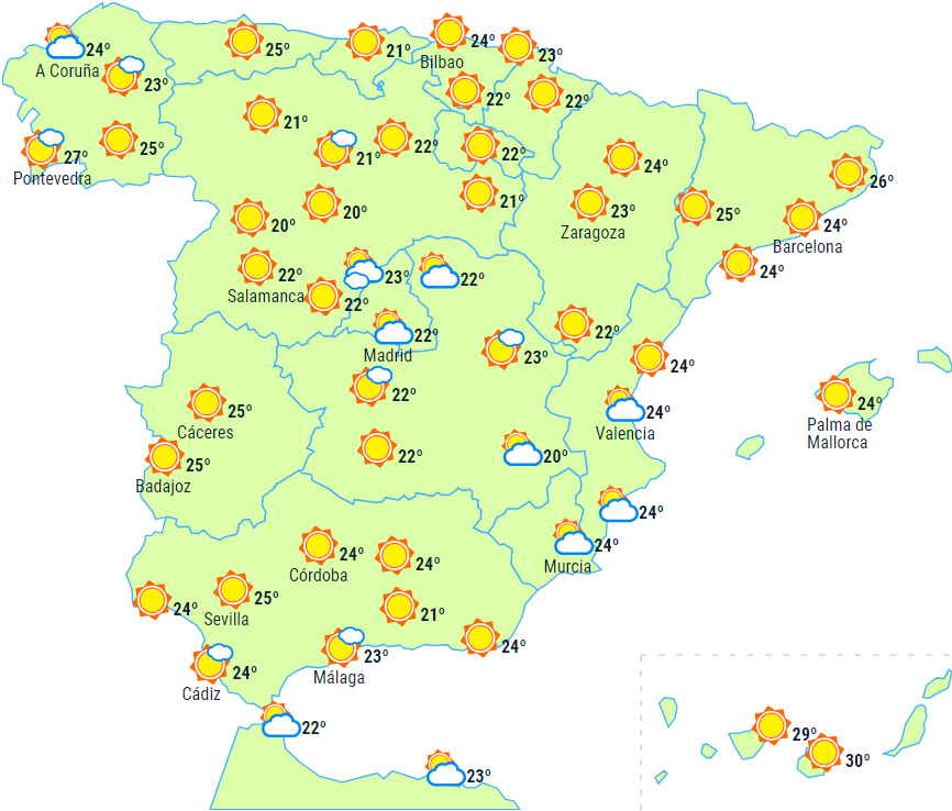 En dag præget af ustabilitet grundet et atlantisk lavtryk, der påvirker både halvøen og De Baleariske Øer, hvilket giver skyet eller overskyet himmel. Der forventes udbredte byger, men særligt over den vestlige tredjedel af halvøen.